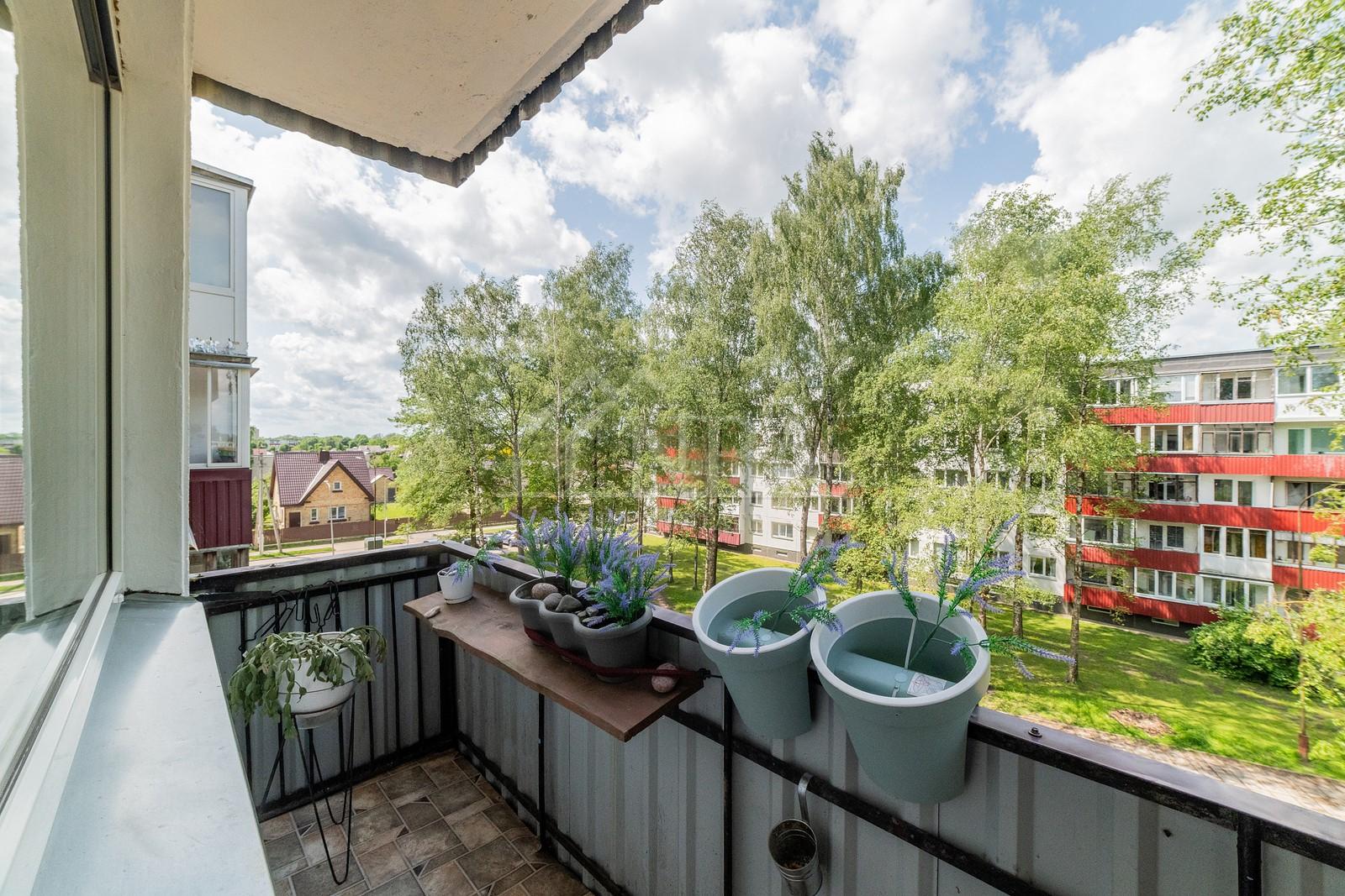 Įstiklintas sutvarkytas balkonas, aliuminio paketai, stumdoma sistema.